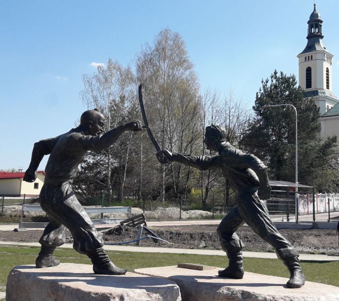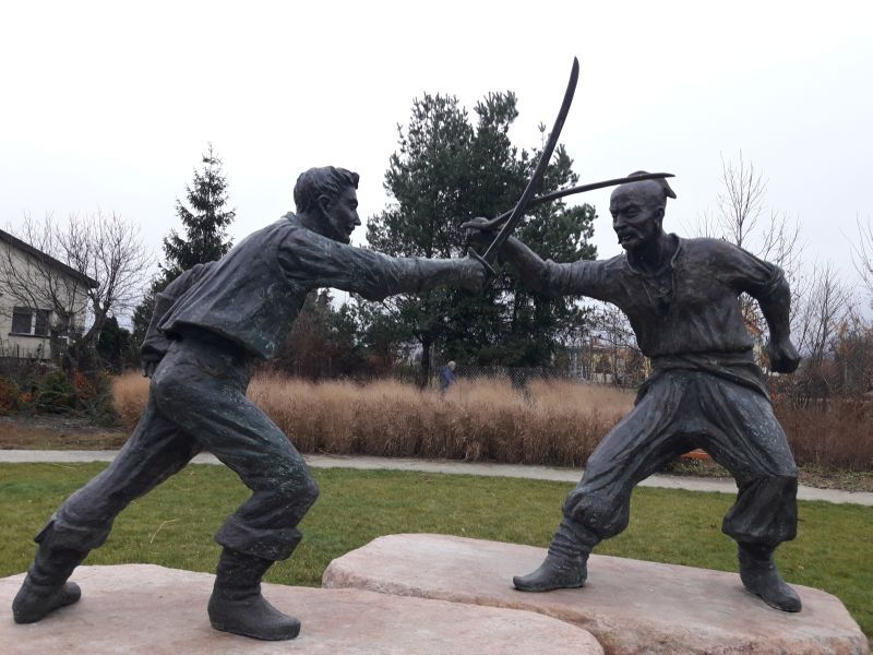 Rzeźba „Pojedynek Bohuna z Wołodyjowskim” powstała z inicjatywy Starosty Warszawskiego Zachodniego Pana Jana Żychlińskiego oraz Wójta Gminy Stare Babice Pana Krzysztofa Turka.